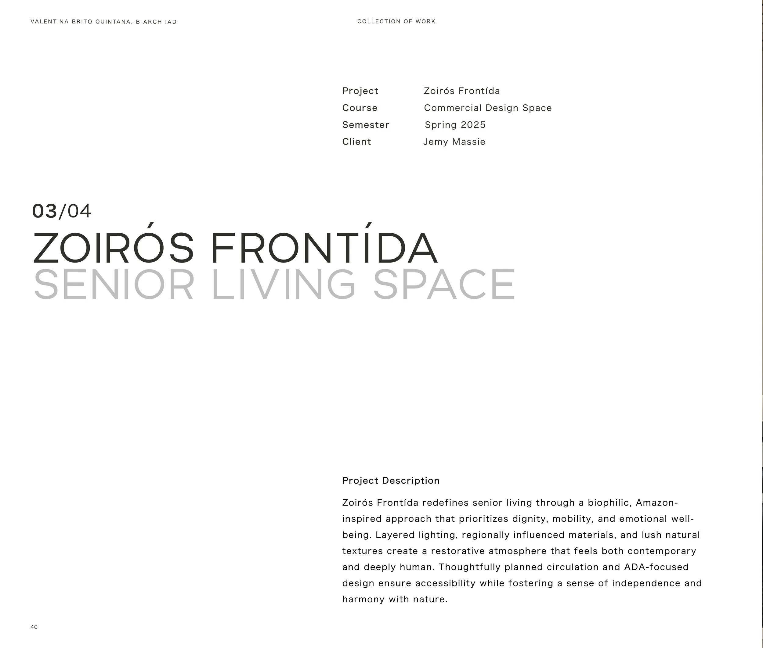Zoirós Frontída redefines senior living through a biophilic, Amazon-inspired approach that prioritizes dignity, mobility, and emotional well-being. Layered lighting, regionally influenced materials, and lush natural textures create a restorative atmosphere that feels both contemporary and deeply human. Thoughtfully planned circulation and ADA-focused design ensure accessibility while fostering a sense of independence and harmony with nature.